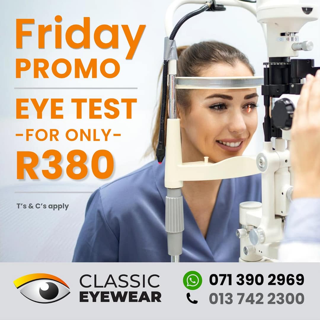 Affordable eye test for only R380 every Friday at Classic Eyewear, I’Langa Mall. Book your eye exam today and trust Nelspruit’s leading optometrist. T’s & C’s apply.