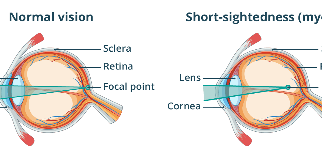 Myopia, commonly known as short-sightedness, is when nearby objects are clear, but things in the distance look blurry. This happens because light entering the eye focuses in front of the retina (the light-sensitive layer at the back of the eye) instead of directly on it. You can think of it like a camera that’s focused too close – far-away scenes come out blurry.